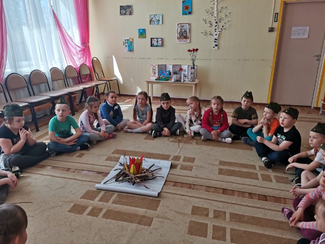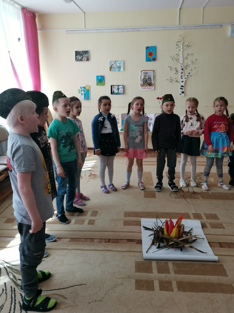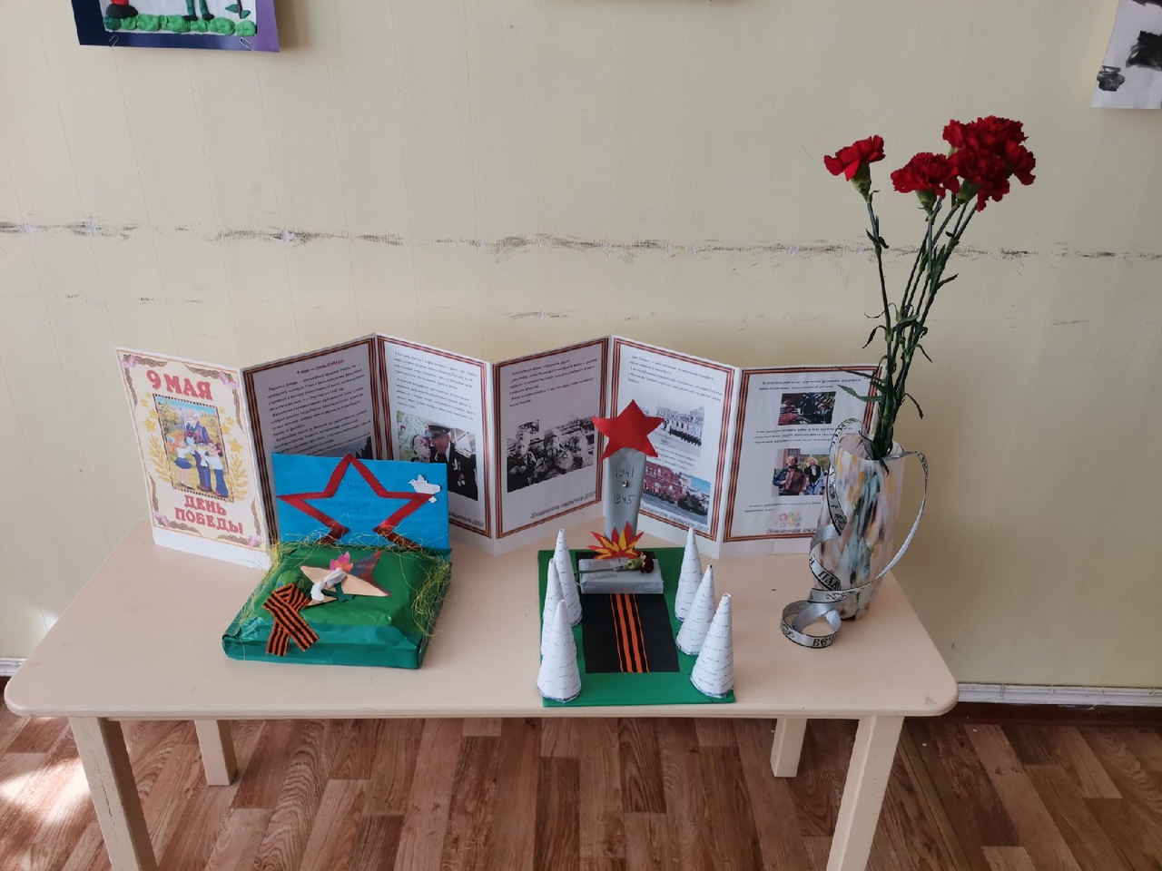 В преддверии празднования Дня Победы в целях патриотического воспитания дошкольников, любви к своей Родине и уважения к людям, которые ковали Победу, формирования положительного эмоционального подъема были оформлены все группы фотографиями военных лет, макетом вечного огня, символикой праздника.