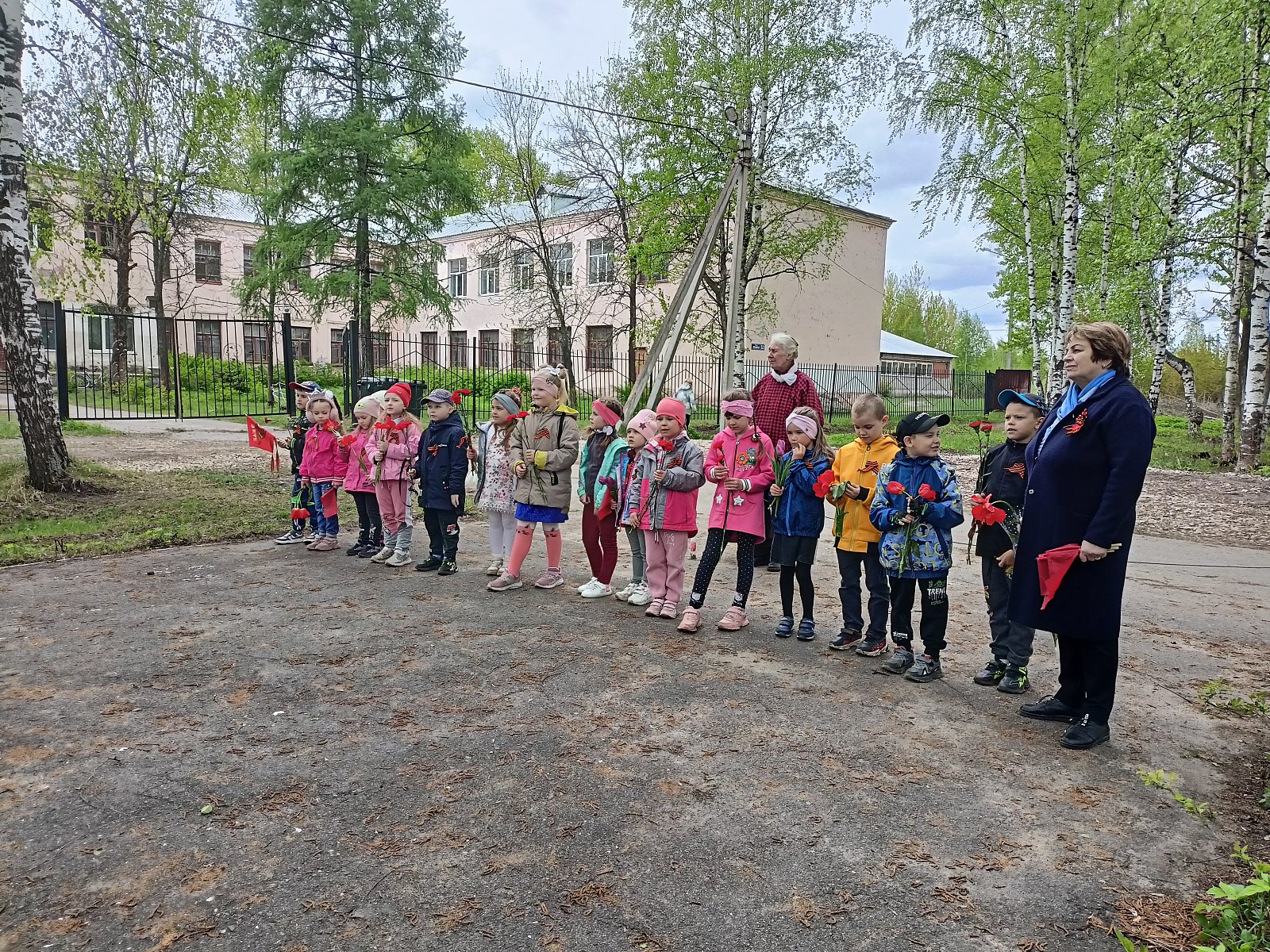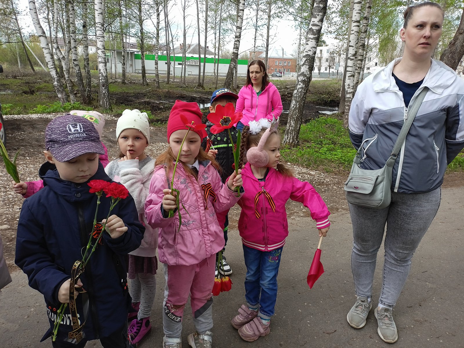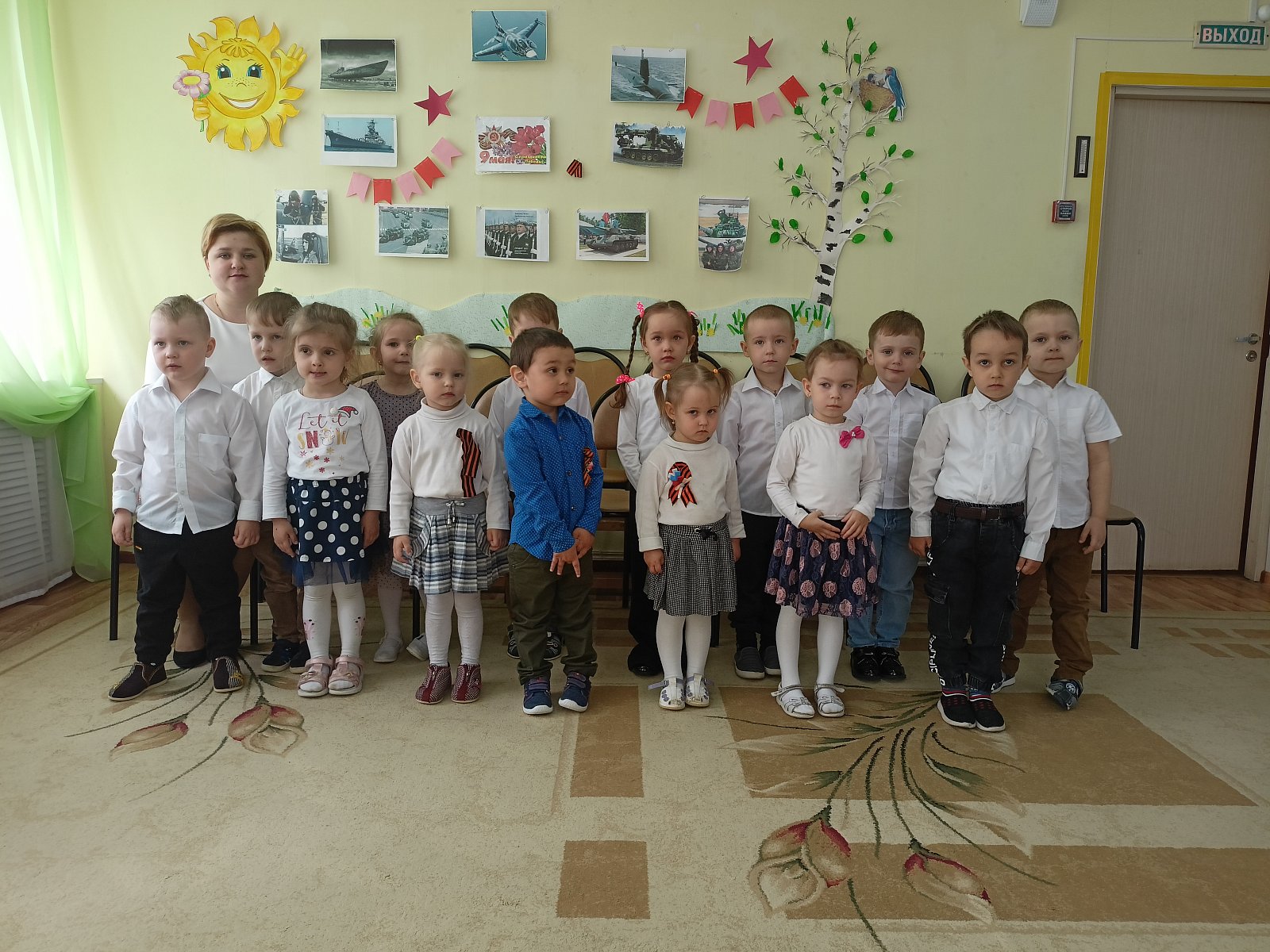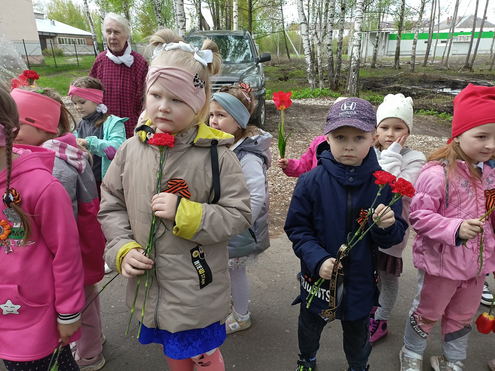 Сегодня в нашем детском саду прошли концерты на группа "Ягодка" и " Солнышко", посвящённые Дню Победы. Ребята пели песни, рассказывали стихотворения, танцевали танцы. После концерта группа " Солнышко" ходили к памятнику и возложили цветы нашим защитникам.