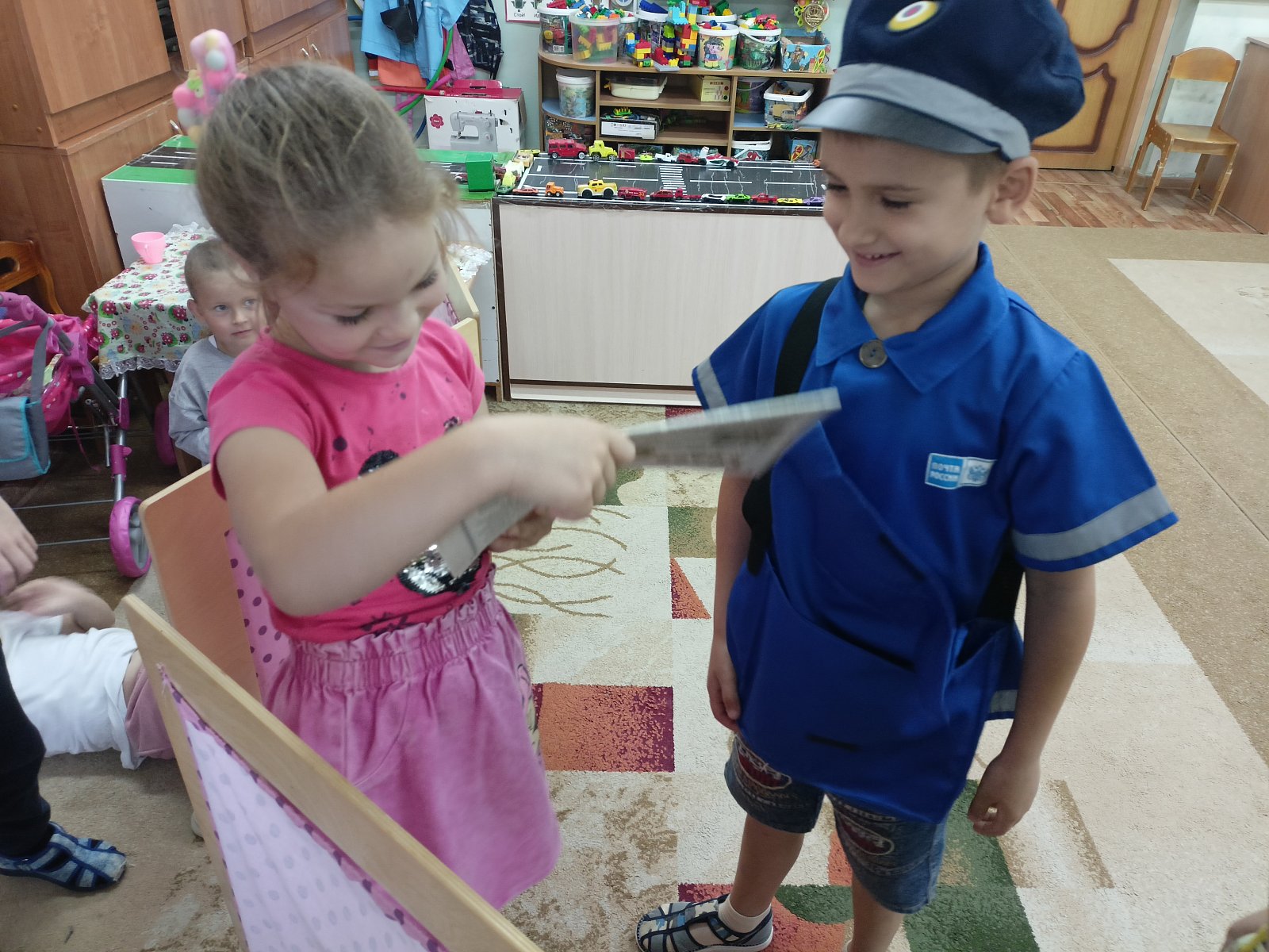 С детьми была организована сюжетно-ролевая игра «Почта», задачами которой были расширить представления детей о профессии почтальона, сформировать умение детей согласовывать свои действия с действиями партнёров, соблюдать в игре ролевые взаимодействия и взаимоотношения, развивать игровой диалог, игровое взаимодействие, активизировать и расширять словарный запас.