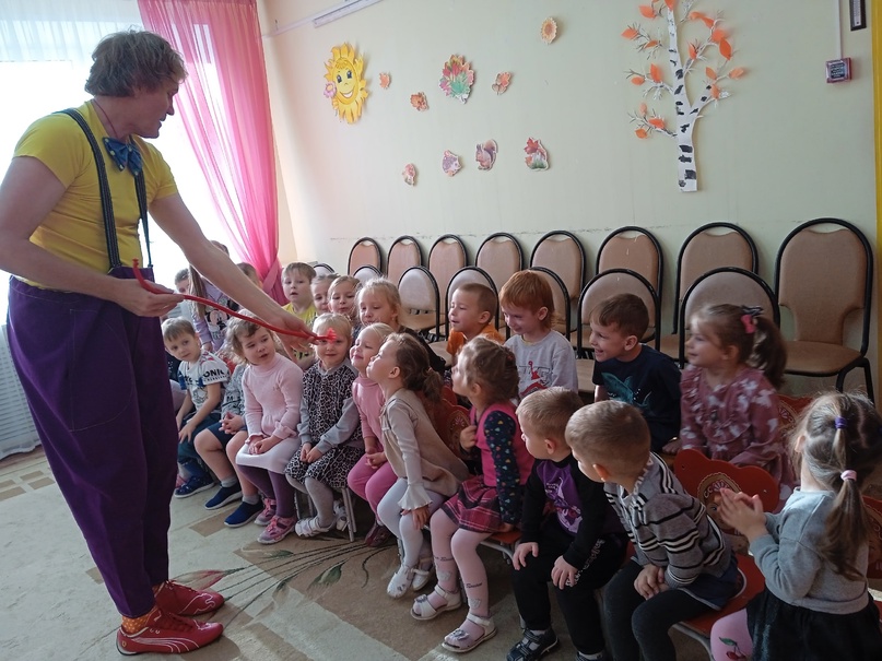Громкая и весёлая музыка встречала детей в нашем зале. Немного ожидания и ребята познакомились с клоуном, который веселил их,жонглировал,показывал разные фокусы. А какие штуки проделывал клоун своими ловкими движениями рук с надувными шарами, превращая их то в собачку, то в меч.