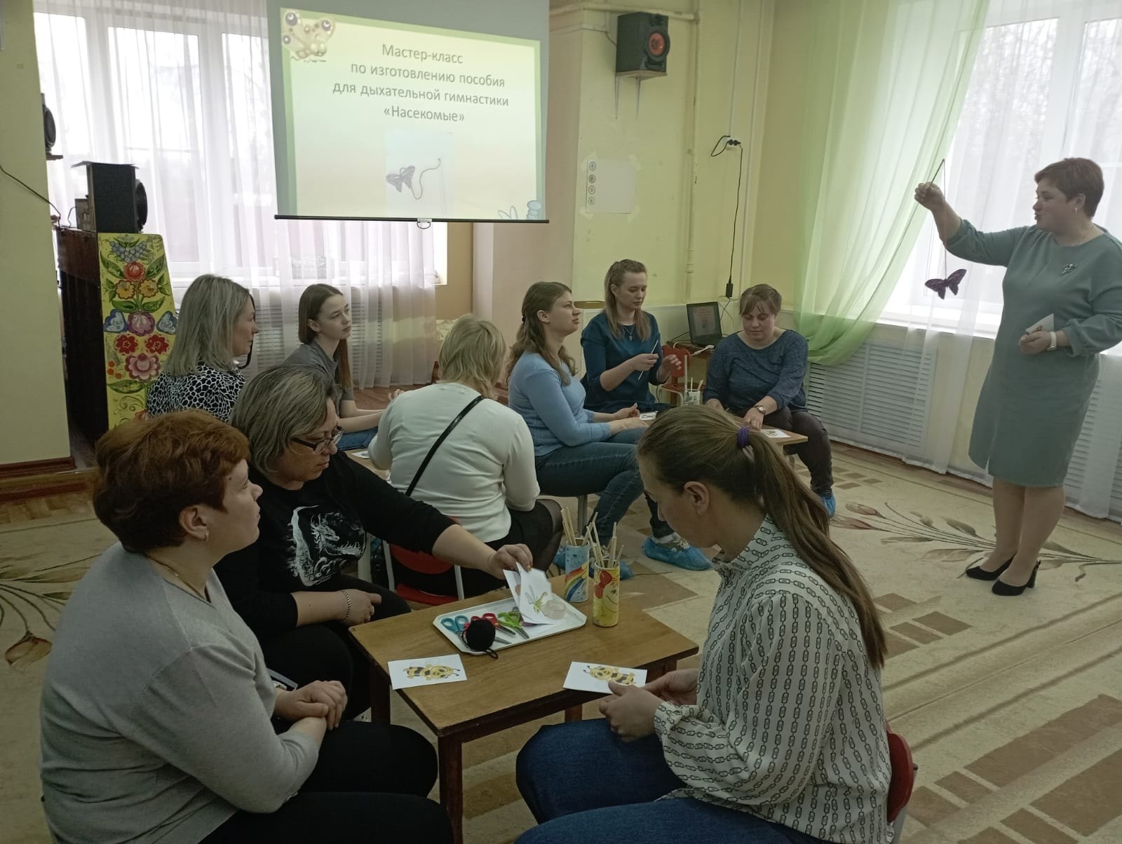 Алексеева А. В., Коблова Н. К. рассказали о сложившейся в организации системе ранней помощи детям с задержкой речевого развития, поделились формами, приемами и способами развития речи у самых маленьких, показали мастер-класс по изготовлению пособия для дыхательной гимнастики.