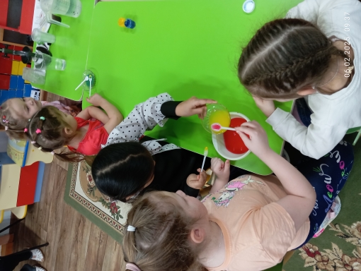 В импровизированной лаборатории дети проводили различные опыты: с солью и сахарным песком , с красками различных цветов, научились создавать различные оттенки путём смешивания красок ; с бумагой и скрепками, с крахмалом и йодом, магнитом и монетками, познакомились с микроскопом : рассматривали кристаллы соли .