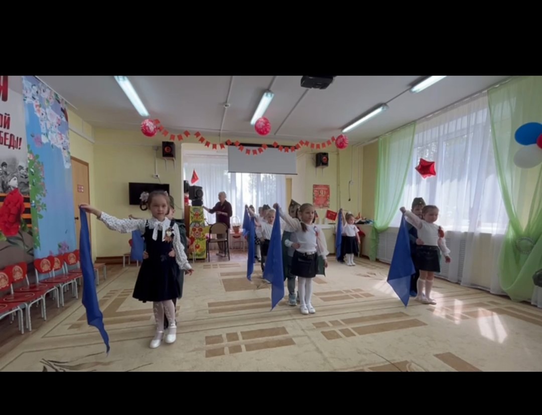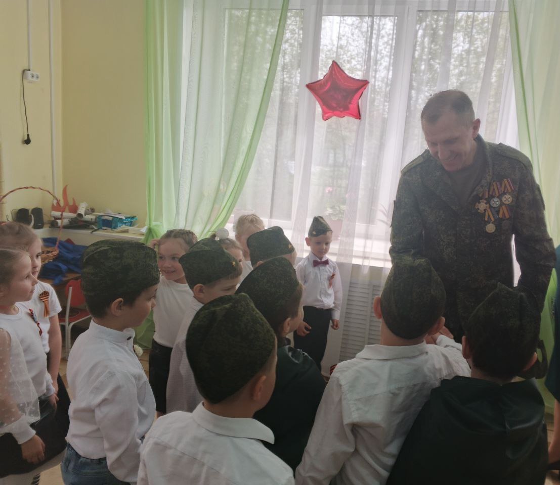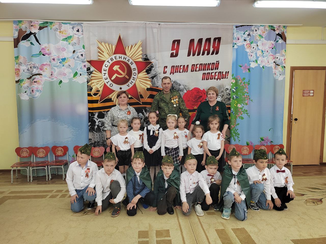 В преддверии празднования 80– ой годовщины со Дня Победы 7 мая в нашем детском саду в старшей группе прошел торжественный утренник, посвящённый этой памятной дате.На торжество были приглашены родители наших воспитанников и действующий участник СВО Волчков Алексей Сергеевич.