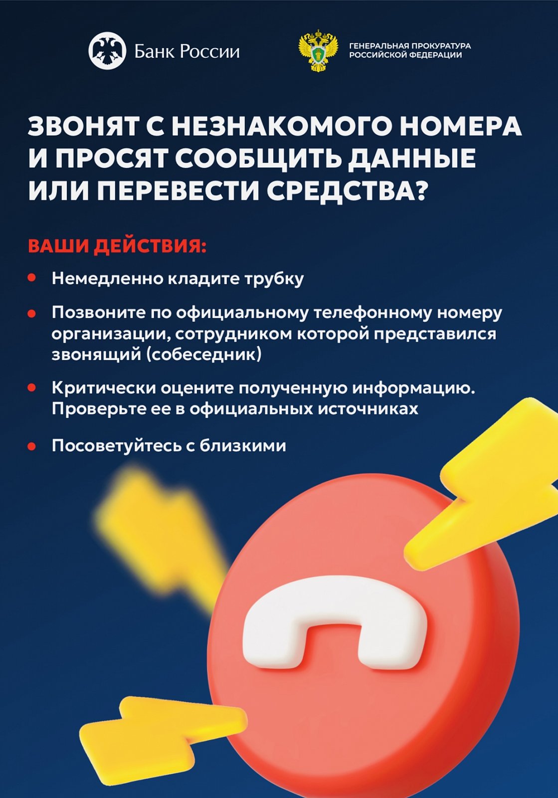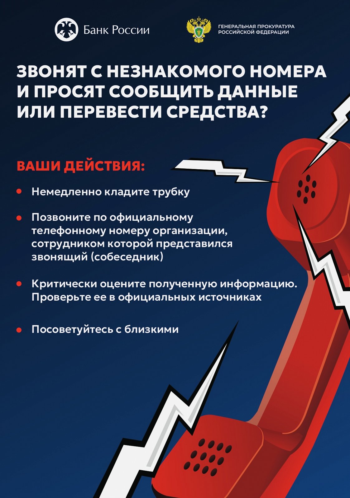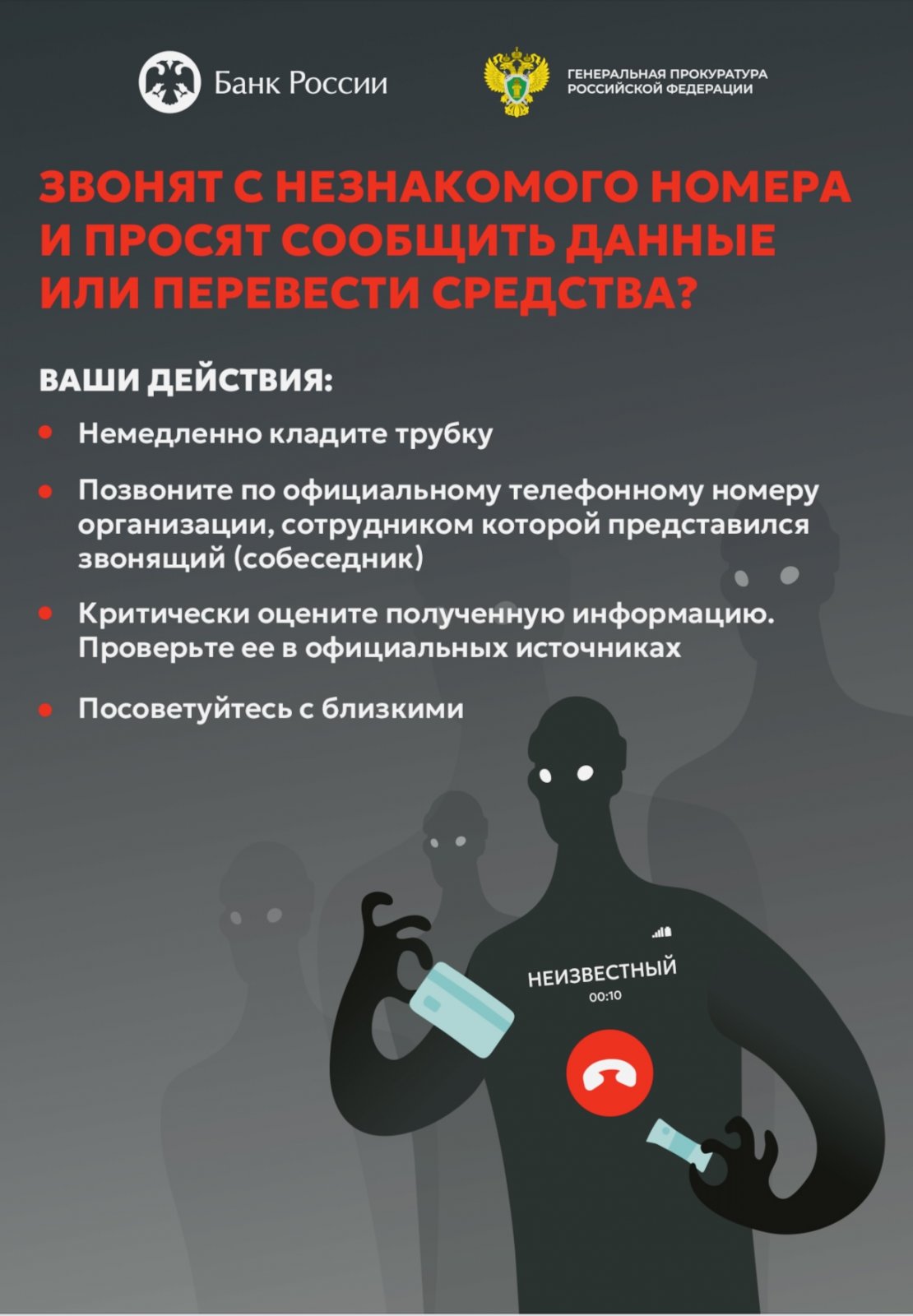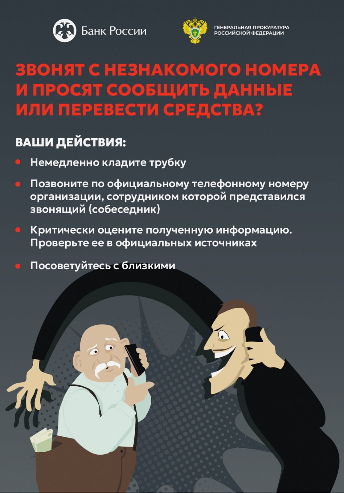 Генеральная прокуратура России вместе с Банком России разработали специальные цифровые плакаты и видеоролики, чтобы предупредить Вас о мошенниках , которые пытаются обмануть людей через телефон или интернет.